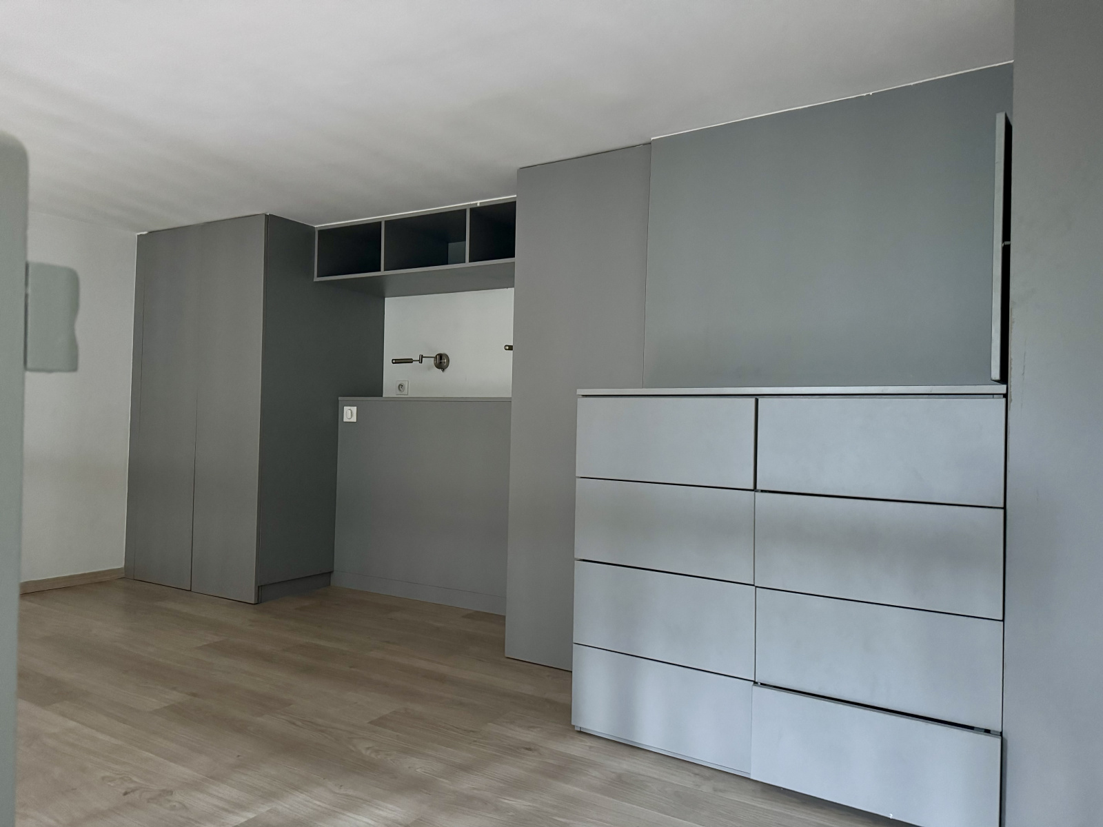 La mezzanine est ammenagée comme coin nuit, avec des rangements et des luminaires.