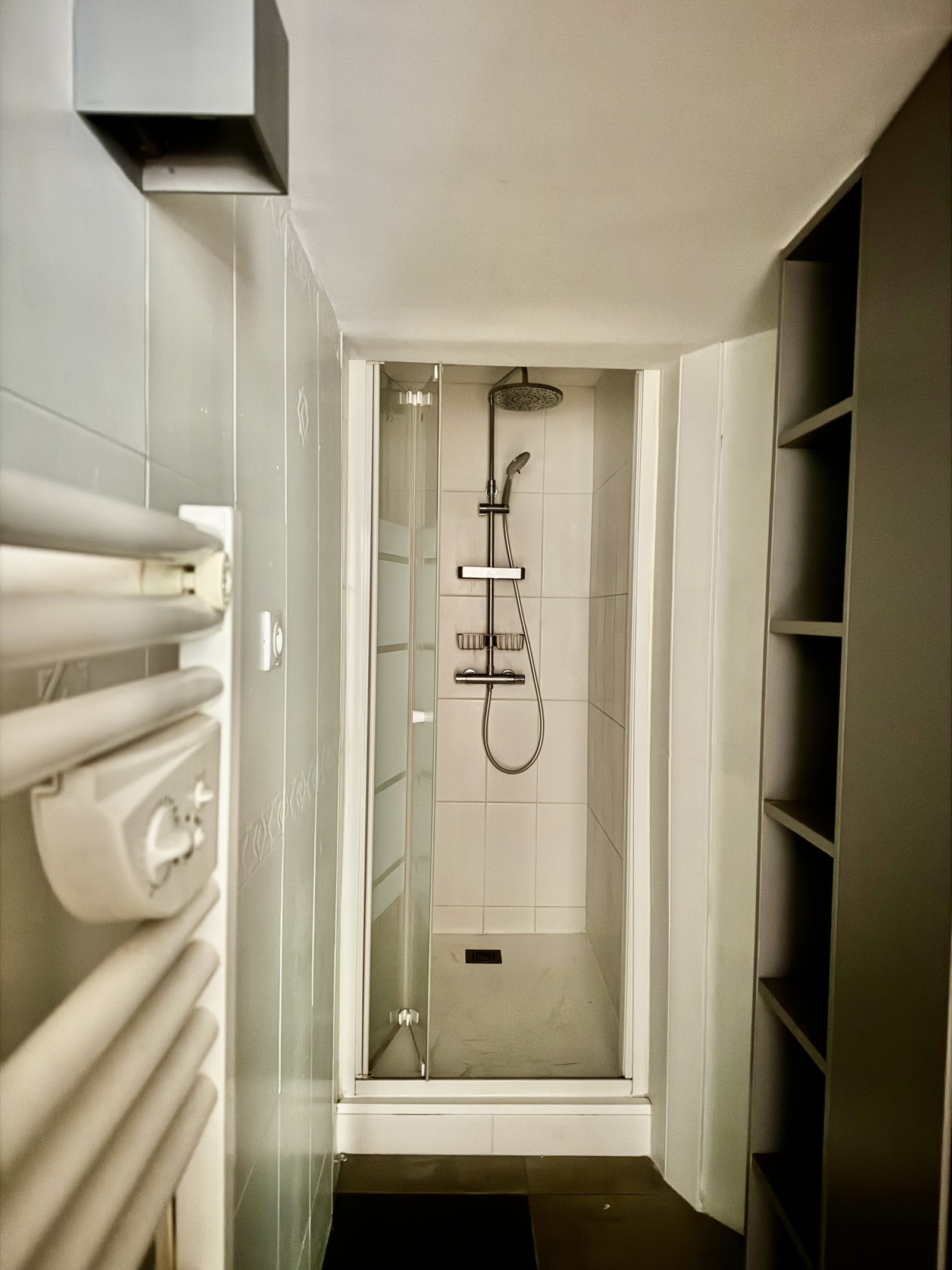 Le WC est séparé. Dans la salle d'eau , cabine douche très récente, un lavabo et des rangements.